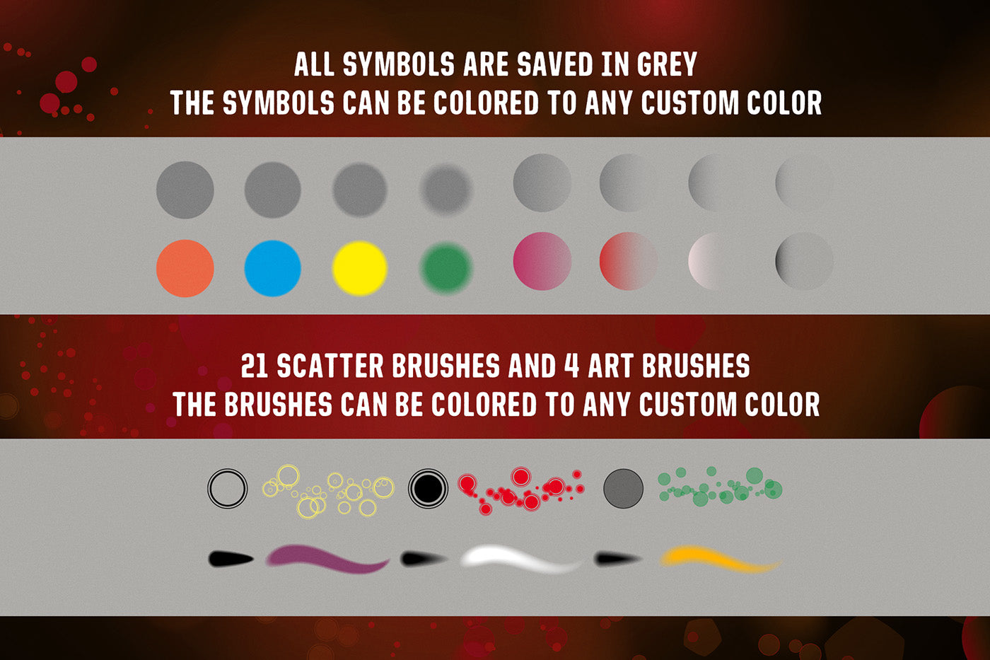 Brushes and Symbols compatible with Adobe Illustrator Version CS4 and higher. Of course also with Adobe Illustrator Version CC and higher.