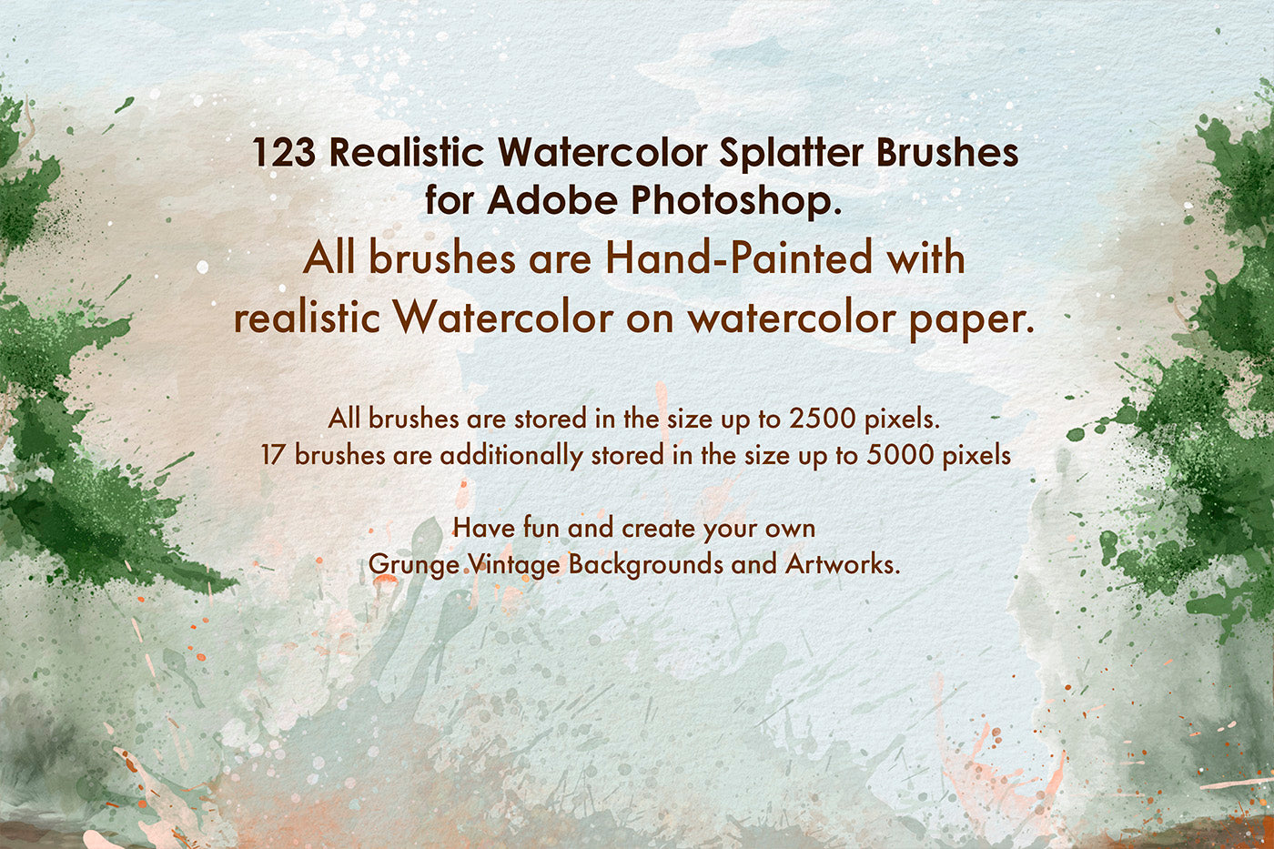 123 Realistic Watercolor Splatter Brushes for Adobe Photoshop. All brushes are Hand-Painted with realistic Watercolor on watercolor paper.